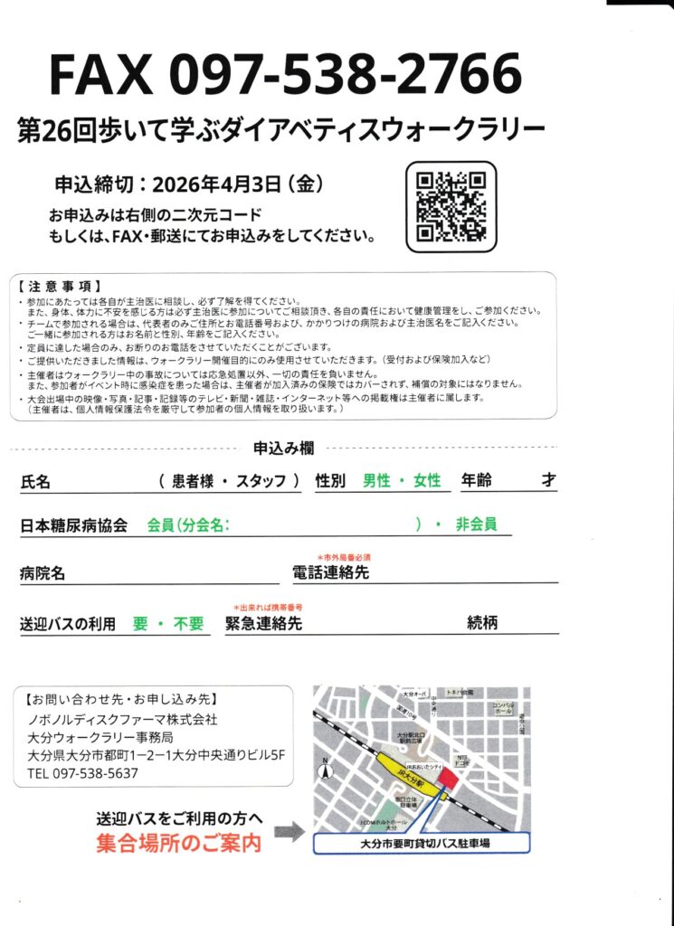 令和8年4月19日日曜日に歩いて学ぶダイアベテイスウオークラリーが別府公園で開催されます。ふるってご参加くださいませ。