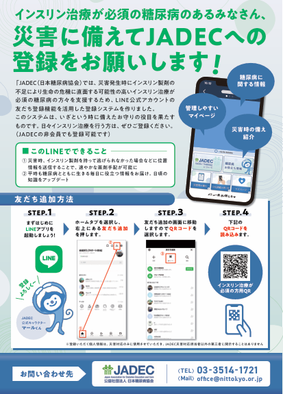 佐賀関大火で被災されました方々にお見舞い申し上げます。JADEC(日本糖尿病協会)では災害時に備えてインスリン治療中の方にLINE登録をお願いしております。詳しくはリンクページをご覧ください。 2025年12月19日 最終更新日時 : 2025年12月19日 ito@